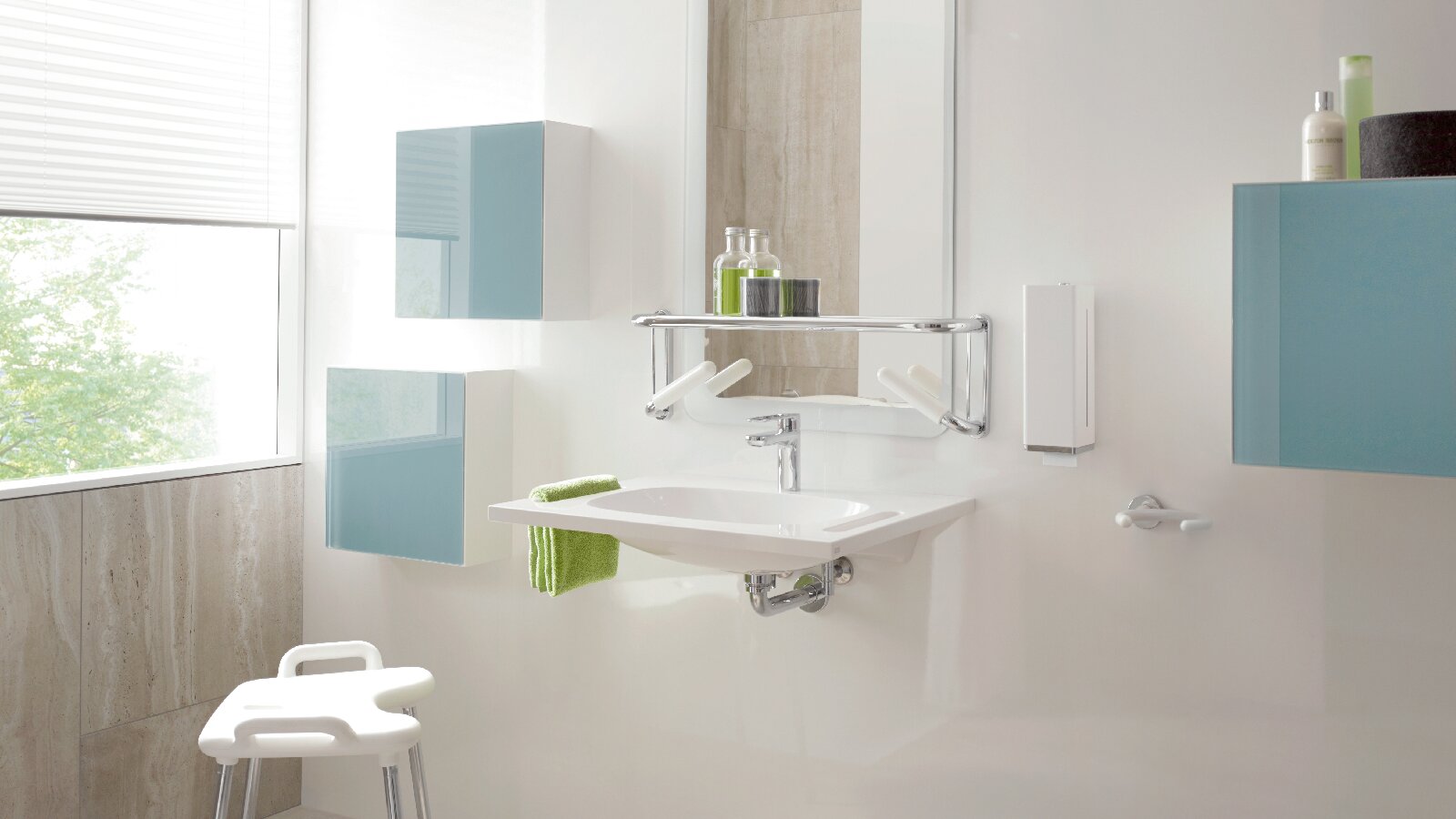 Auch bei diesem System wurde bei der Entwicklung auf verstellbare Höhe einzelner Module geachtet. Dies betrifft gerade in der Pflege wichtige Bereiche wie Stützklappgriffe an der Toilette oder höhenverstellbare Duschsitze. Elemente und Berührungsflächen sind in verschiedenen Farbvarianten bestellbar und unterstützen sowohl visuelle, haptische als auch ästhetische Anforderungen.