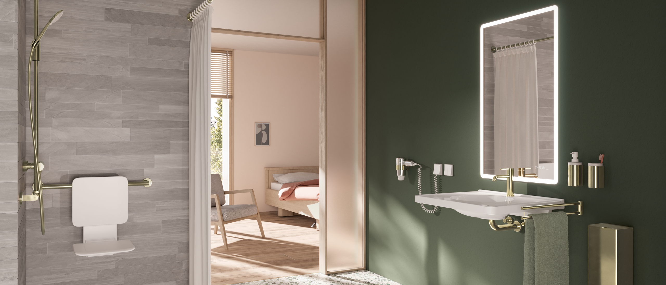 Für die Umsetzung im Bestand sind passende Ausstattungsprodukte erforderlich, die den technischen Anforderungen gerecht werden. HEWI bietet hierfür praxisnahe Lösungen wie Duschsitze, Haltegriffe, Brausehalterstangen sowie den patentierten Magnetbrausehalter – abgestimmt auf den Einsatz im barrierefreien Duschbereich.