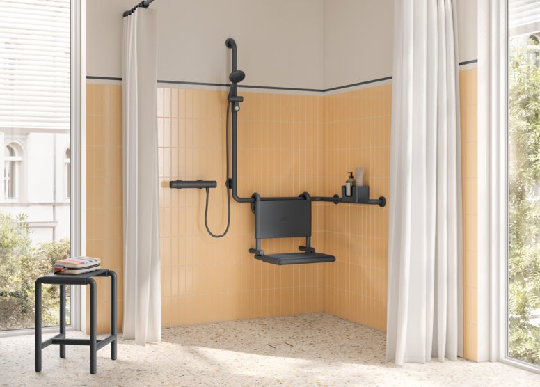 Auch bei der normgerechten Planung barrierefreier Duschen bestehen vielfältige gestalterische Möglichkeiten. Besonders matte Oberflächen eröffnen Spielräume in der Farbgestaltung und Materialwahl, ohne funktionale Anforderungen zu vernachlässigen. HEWI bietet hierfür abgestimmte Systemlösungen – etwa Brausethermostate, Haltegriffe und Duschsitze in Schwarz matt und Weiß matt oder gebürsteten und glänzenden PVD-Oberflächen.