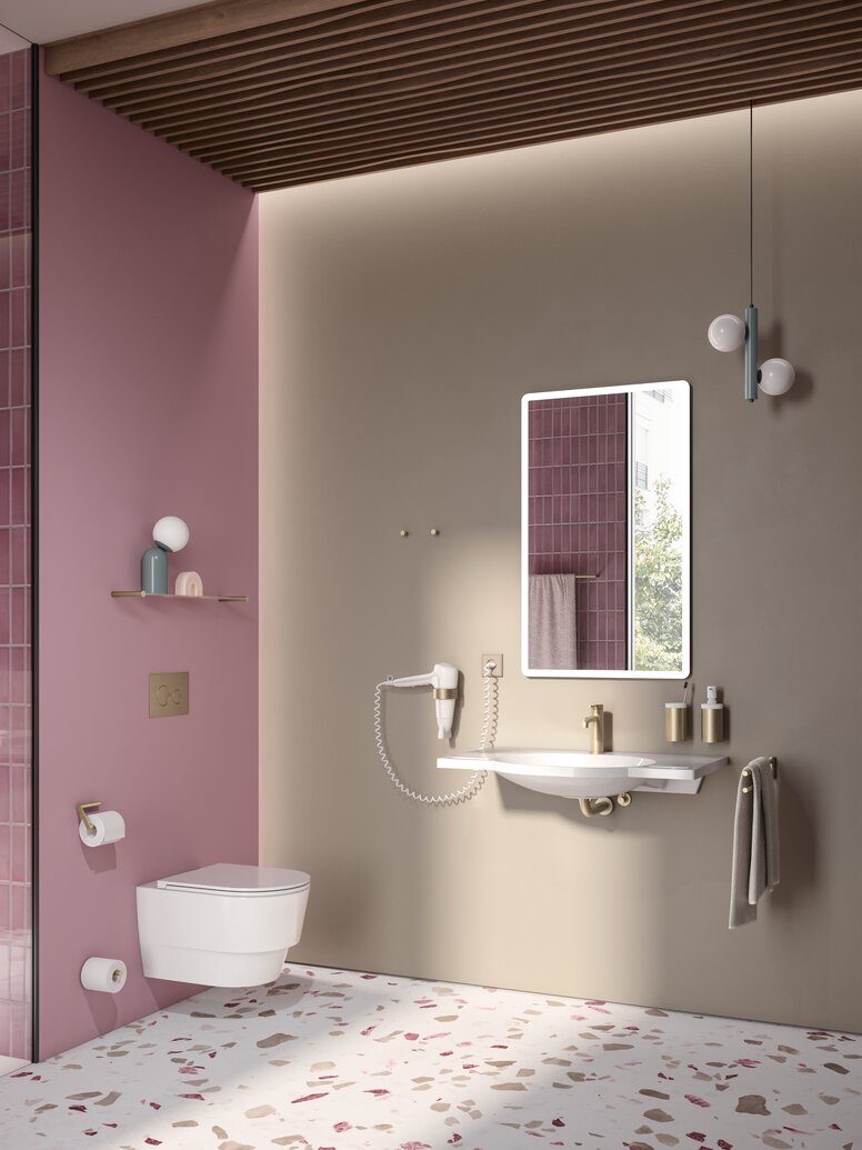 Auch in Sanitärräumen im Hotel wünschen sich die Gäste eine einladende Atmosphäre. HEWI ermöglicht nun mit den neuen Oberflächen, darunter Messing gebürstet, einen noch größeren Planungsspielraum.