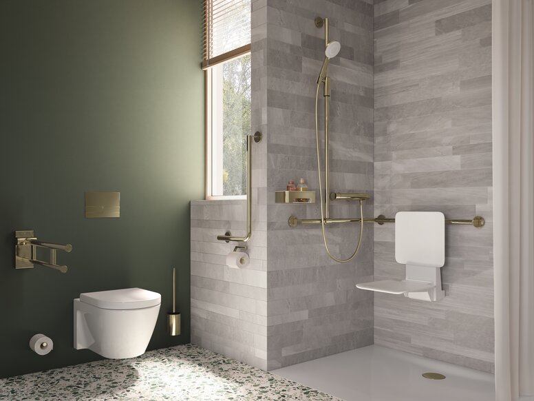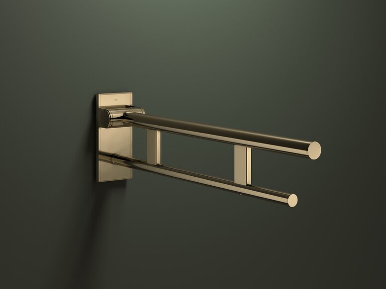 Edle Anmutung im barrierefreien Sanitärraum. Der bewährte HEWI Stützklappgriff in Messing glänzend bringt Wärme und Wohnlichkeit in Badezimmer.