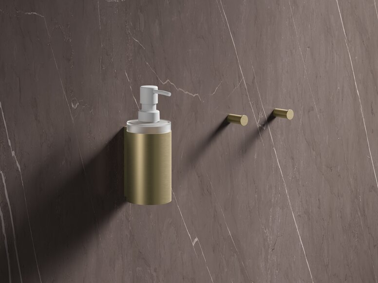 Seifenspender und Handtuchhaken in Messing gebürstet. Die neue Oberfläche wird bei HEWI im umweltschonenden PVD-Verfahren gefertigt.