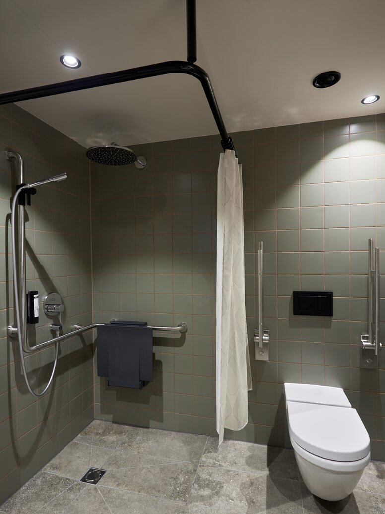 „Unser Ziel ist sowohl eine ästhetische als auch die normgerechte, barrierefreie Gestaltung ohne Kompromisse“, betont Antonia Wileschek, Produktmanagerin Design bei HEWI. Zudem wählten Dreimeta für das Cocoon die Vorhangstange mit Deckenabhängung aus der HEWI Designklassiker-Serie 477/801 aus. Der Duschhandlauf mit Brausehalterstange stammt aus der Serie 805, die wie die Serie 477/801 auf dem Rundrohrdesign beruht. „Mit den HEWI Produkten lassen sich die barrierefreien Zimmer und Bäder genauso ästhetisch und wohnlich gestalten wie die übrigen Bereiche“, betont die Innenarchitektin Andrea Kraft-Hammerschall.