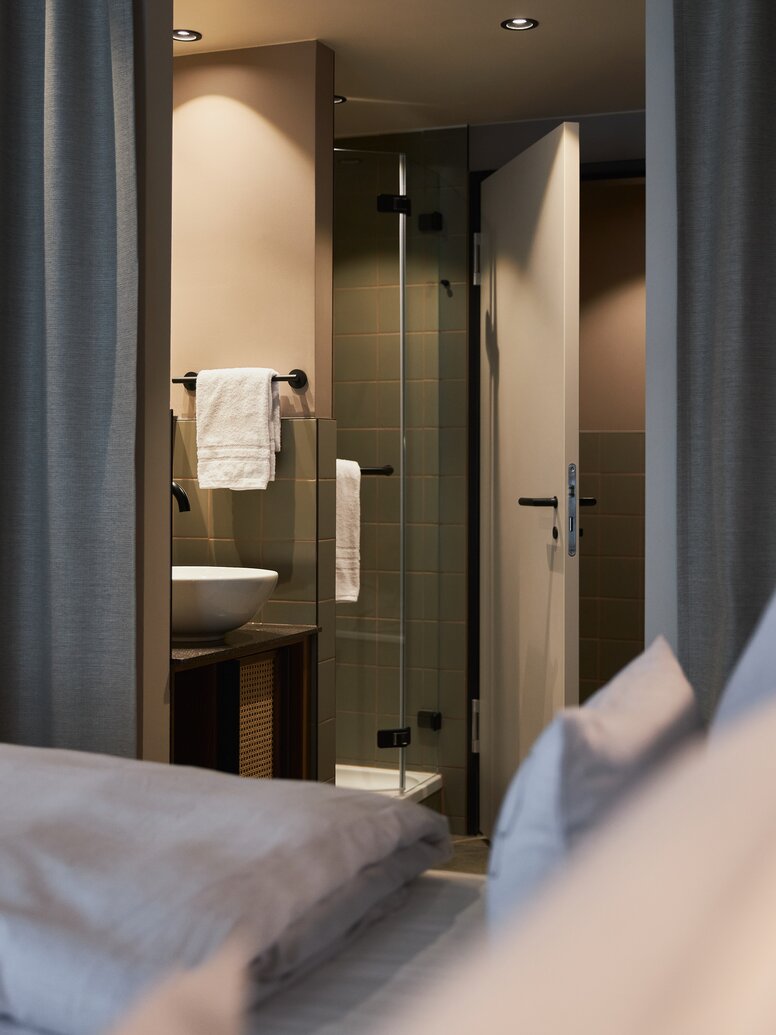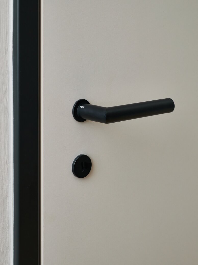 Schwarze Accessoires, wie Bettleuchten oder Garderobenstangen ergänzen das Interior in den Räumen des Cocoon. Dazu passend wählten Dreimeta das zeitlose und minimalistische Türdrücker System 162 von HEWI in edlem Schwarz matt aus. „Die Lösungen von HEWI sind schlicht und funktional und ergänzen unsere Innenarchitekturkonzepte immer sehr gut, ohne sich in den Vordergrund zu stellen“, sagt Andrea Kraft-Hammerschall, Innenarchitektin und CEO des Büros Dreimeta.