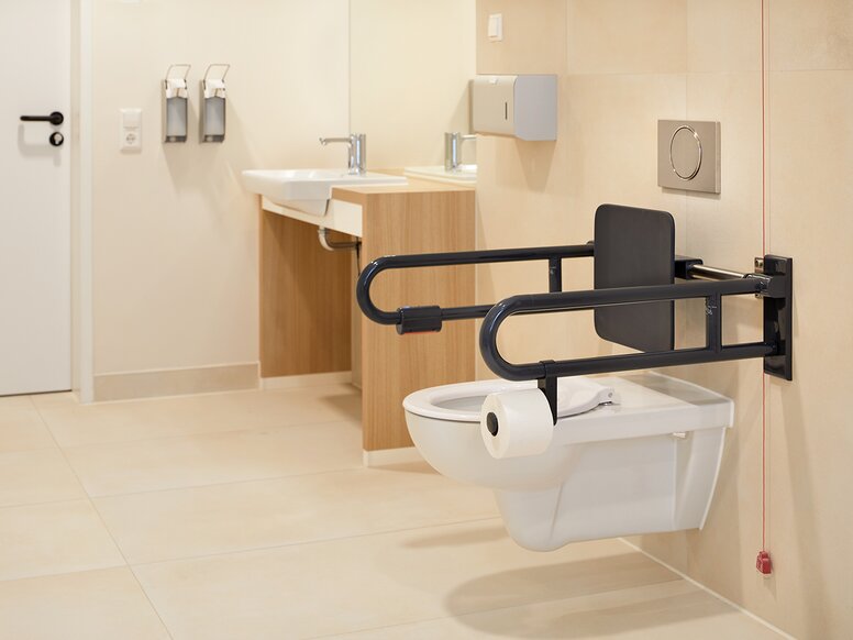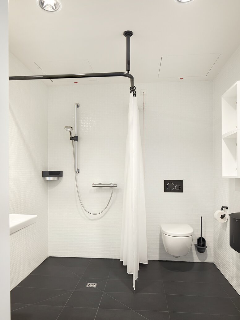 Die ästhetischen und qualitativ hochwertigen HEWI Sanitärprodukte der barrierefreien Serie 477/801 und des System 900 ermöglichen den Nutzenden maximalen Komfort und Selbstständigkeit im Badezimmer – in der heutigen Zeit ein enorm wichtiger Aspekt auch hinsichtlich der Entlastung des Pflegepersonals. Die Komponenten der Serie 477/801 bestehen aus durchgefärbtem Polyamid und sind unempfindlich gegenüber Wundbehandlungs- und Reinigungsmitteln. Sie halten selbst sehr starker Frequentierung und jahrelanger Dauer- und Extrembelastung konsequent stand. Bis ins kleinste Detail durchdacht, setzen die Bad-Accessoires wie die Duschvorhangstange und die Brausehaltestange, der WC-Rollenhalter und die WC-Bürstengarnitur sowie Abfallbehälter in Polyamid mit matter Oberfläche edle Akzente in den modern gestalteten Bädern. Besondere Sicherheit bietet die Kombination aus Rückenstütze und Stützklappgriff, die genau an die Bedürfnisse von motorisch eingeschränkten Menschen angepasst ist. Aufgrund ihrer porenfreien und leicht zu reinigenden Oberfläche erfüllen die Polyamidlösungen die strengen Hygienevorschriften.