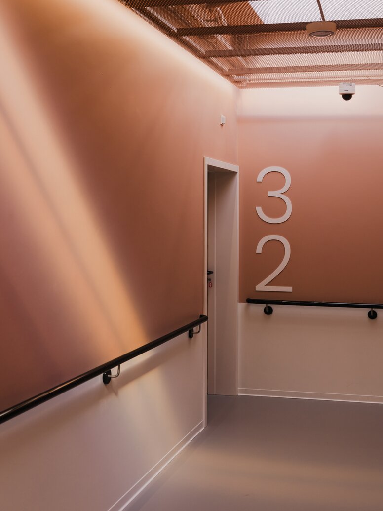 Unterstützt wird dieser Effekt durch die Unterteilung des Gebäudes in verschiedene Farbzonen. Der gezielte Einsatz von Farben und Farbkontrasten an Treppen, Türen und Funktionselementen fördert zudem die intensivere Wahrnehmung von Menschen mit Sehbehinderung oder Demenz. Deutlich zu sehen ist das beispielsweise an der dominanten Treppe, einer harmonischen Verbindung aus terracottafarbenem Lochblech und hellem Holz, die sich stark von den hellen Wänden abhebt und zugleich die klare räumliche Trennung des Treppenraumes markiert.