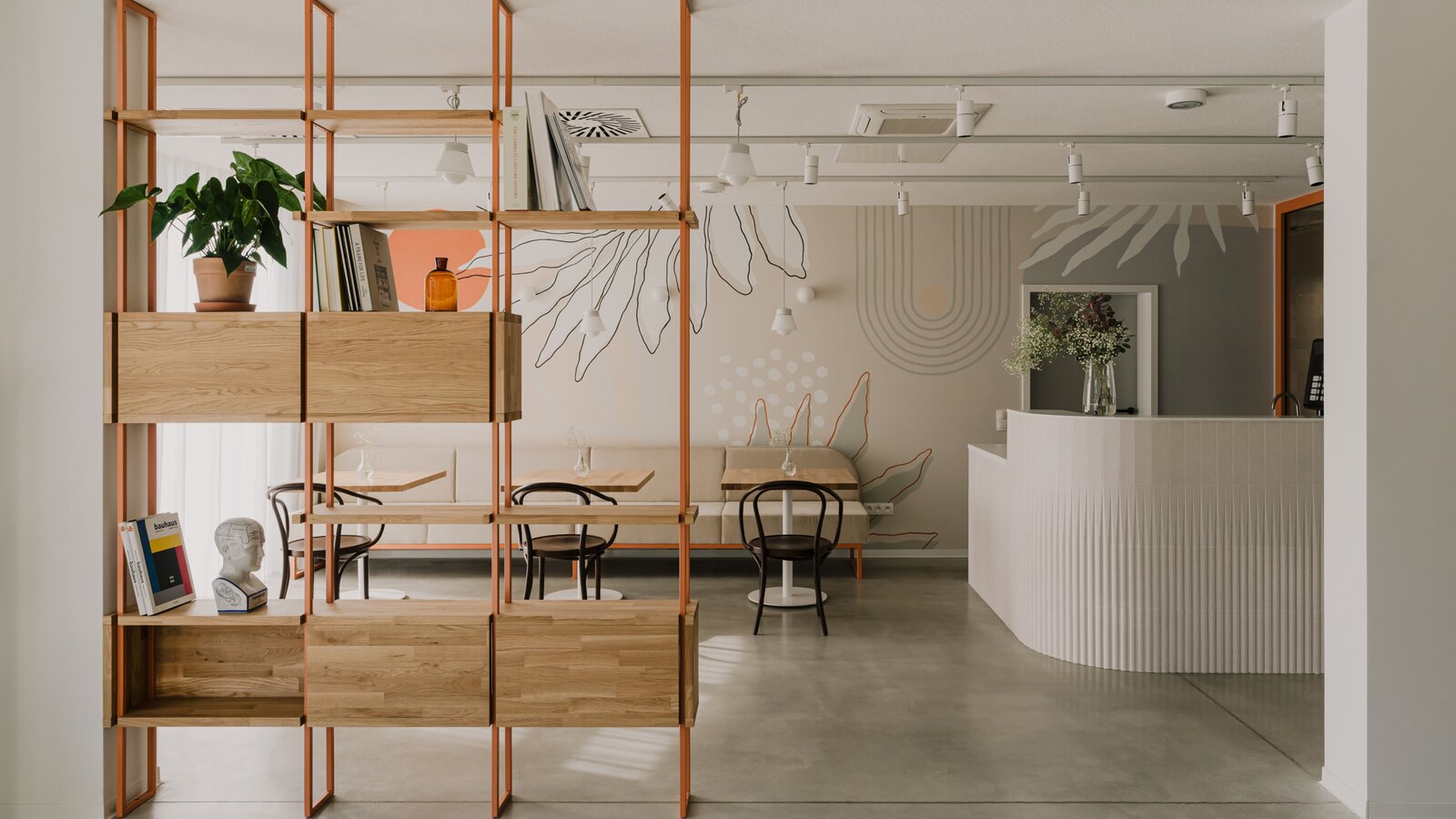 Das Farbkonzept der Innenräume ist inspiriert von der umgebenden Natur: Warme Erdtöne finden sich an Möbeln und Baubeschlägen wieder. Malereien mit Motiven aus der Pflanzenwelt und Seelandschaft zieren Café, Essraum und Wintergarten, grafische Ornamente an verschiedenen Wänden stellen ebenfalls den direkten Bezug zur Flora her.