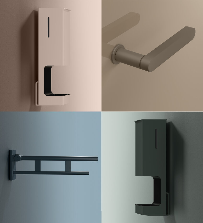 Farbe bietet zahlreiche Möglichkeiten, Räume zu gestalten. So lassen sich ausdrucksstarke Statements setzen. Viele Produkte aus System 900 können Sie in Ihrem Wunschfarbton gestalten, darunter Stützklappgriffe oder Spender. Ebenso möglich ist es, eine der HEWI Lieblingsfarben zu wählen. Damit entstehen einzigartige Farbkonzepte, die jedem Raum einen individuellen Touch verleihen und einen persönlichen Wiedererkennungswert schaffen.
