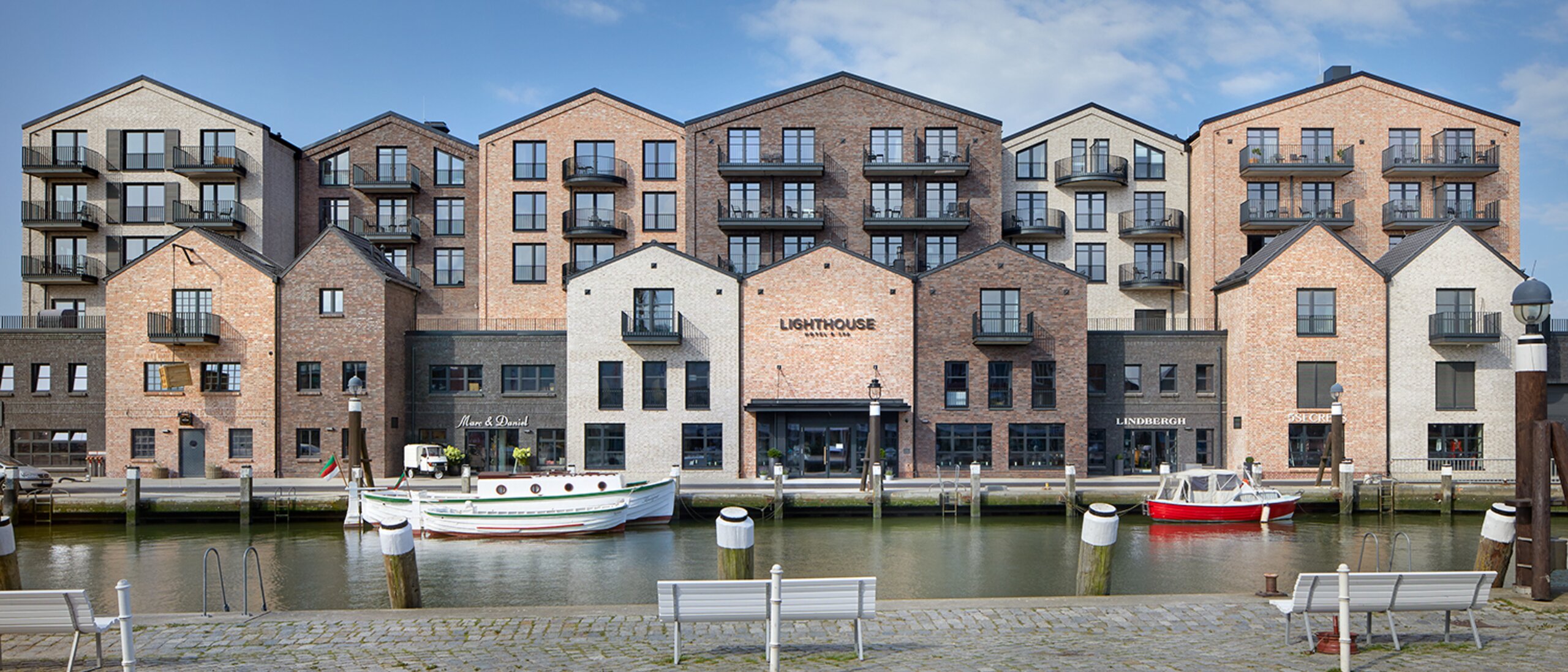 Das große Bauvolumen wurde in kleinteilige einzelne Baukörper aufgeteilt und vermittelt einen typisch norddeutschen Hafencharme. Auf den Betrachter und die Betrachterin wirkt das Lighthouse Hotel & Spa dadurch wie ein Ensemble unterschiedlicher Gebäude, das neben dem Hotel auch drei Restaurants, Tagungsräume, einen Feinkostladen, zwei Shops und eine Hafenkneipe beherbergt.
