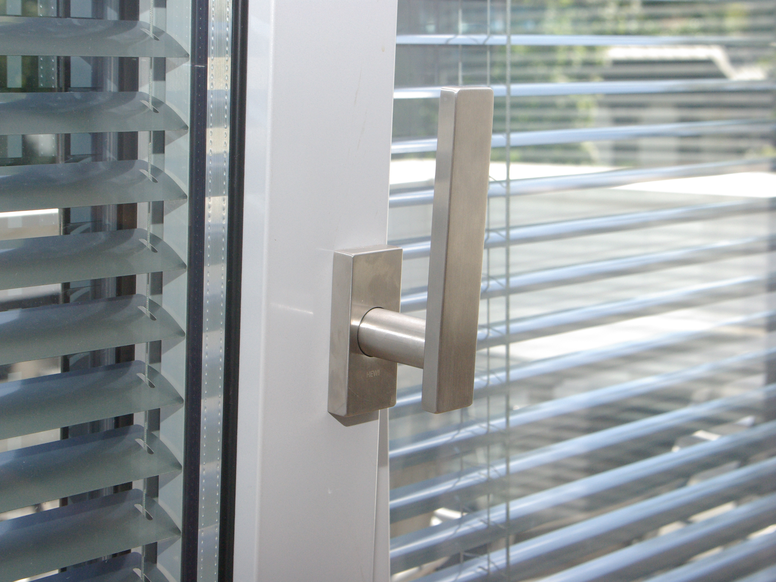 An den Türen und Fenstern wurde die ausdrucksstarke Beschlagsserie 180 in der Edelstahlvollversion eingesetzt. Die Beschläge werden aus massivem Edelstahl gefräst und erhalten so ihre eigenständige Kontur. Das Designkonzept der Serie 180, das auf einem Rechteck basiert, nimmt Bezug auf den quaderförmigen Grundriss des Gebäudes. Die Kombination mit quadratischen Rosetten unterstreicht die geometrische Formensprache der Türdrücker.