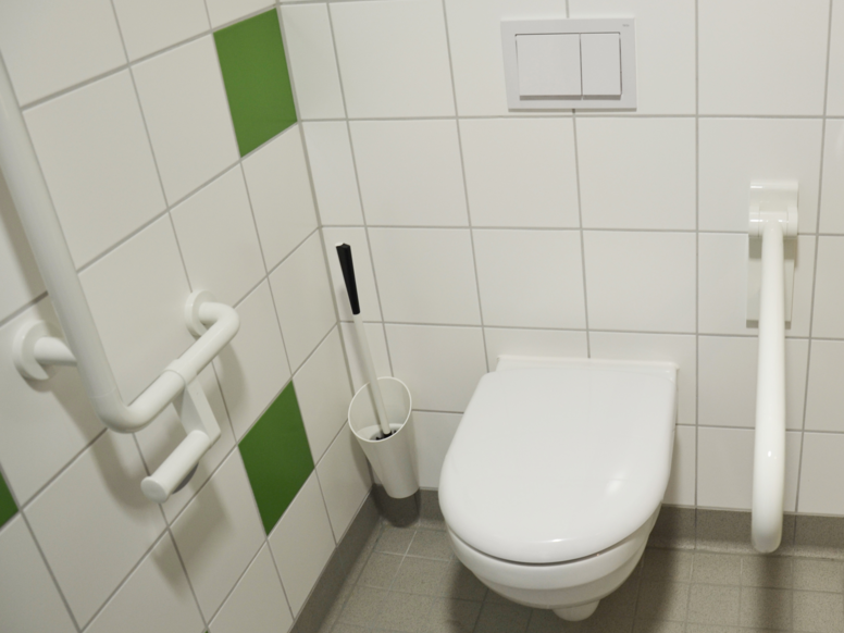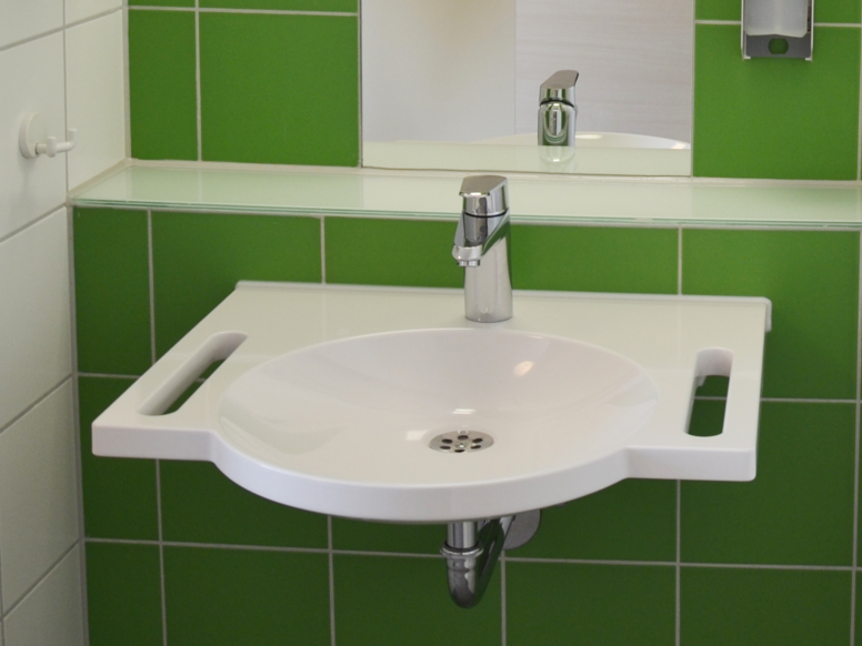 Pflege, wenn sie notwendig ist, menschenwürdig zu gestalten, ist ein weiterer wichtiger Ansatz. Hierzu setzt das Konzept besonders auf die Privat- und Intimsphäre des Einzelnen. Aus diesem Grund verfügt jedes Appartement über ein Badezimmer. Diese sind so gestaltet, dass sie dem Nutzer Unterstützung bieten. Der Waschtisch verfügt über integrierte Haltegriffe, sodass man sich an ihm abstützen oder mit einem Rollstuhl heranziehen kann. Dusche und WC sind mit Haltesystemen ausgestattet, die Sicherheit geben und die Bewegungsabläufe unterstützen. In der Dusche wurde zudem ein klappbarer Duschsitz installiert. Dieser kann, wenn er nicht benötigt wird, platzsparend an die Wand geklappt werden. Durch die zurückhaltende Gestaltung werden die barrierefreien Produkte nicht als störend empfunden, wenn sie nicht genutzt werden.